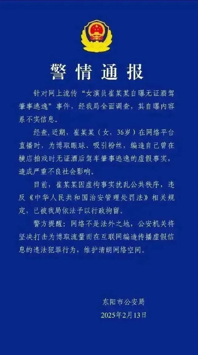 2月13日,浙江省东阳市公安局发布警情通报:针对网上流传“女演员崔某某自曝无证酒驾肇事逃逸”事件,经该局全面调查,其自曝内容系不实信息。